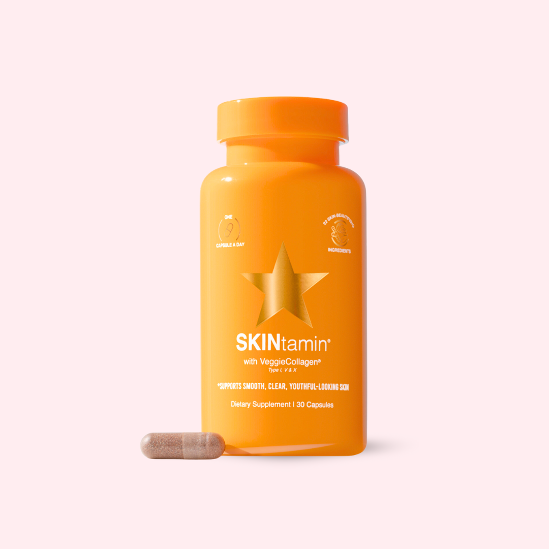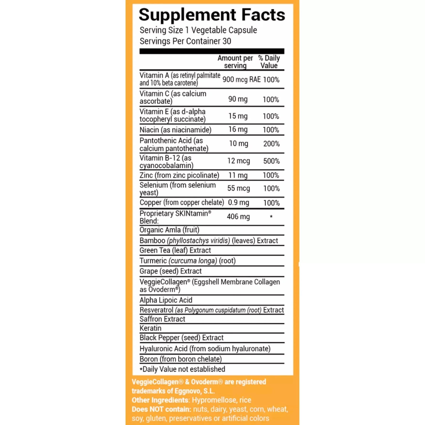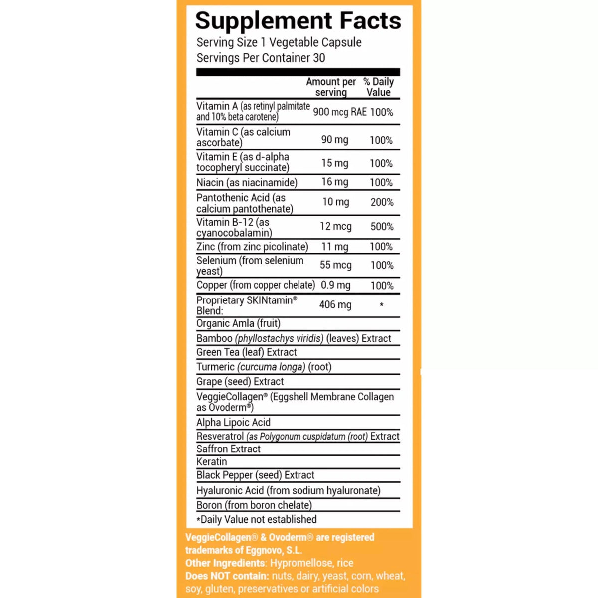 SKINtamin® by HAIRtamin® es una fórmula integral para embellecer la piel con 22 ingredientes limpios, incluyendo colágeno 100% vegetariano (tipo I, V & X) derivado de la membrana del huevo, fruta de amla orgánica, extracto de azafrán, resveratrol, vitamina A, C, E, B12, zinc y ácido hialurónico. Todo esto para apoyar la salud de tu piel desde adentro💃🏼💊